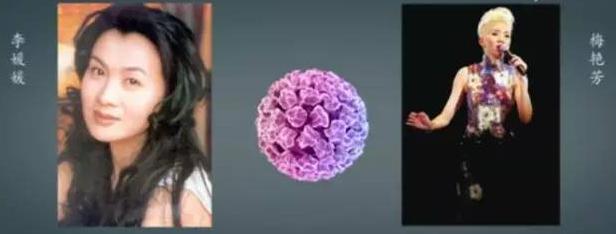 图片中这两位美丽的女子,大家都认识,一位是李媛媛,一位是梅艳芳,香港著名的艺人,她们都是因为同一种疾病——宫颈癌,而英年早逝的。这两位女性中间的那个,看着还很漂亮的,美丽的一个球体,其实它很可恶,叫人乳头瘤病毒。如果女性长期地存在生殖道的感染,就可能发生宫颈癌的致病。