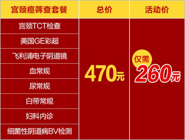 此次活动包含:宫颈TCT检查、美国GE彩超检查、飞利浦电子阴道镜检查、血常规、尿常规、白带常规、妇科内诊、细菌性阴道病BV检测,共计470元,活动期间仅需260元。活动时间截至本月底,女性朋友可抓紧时间参与!